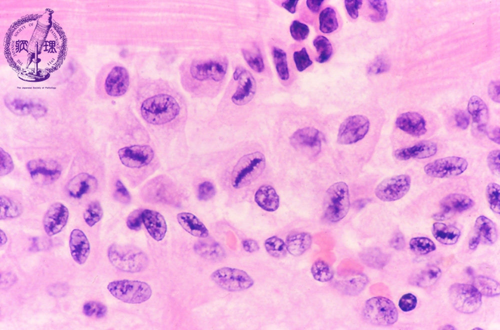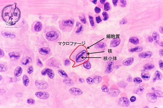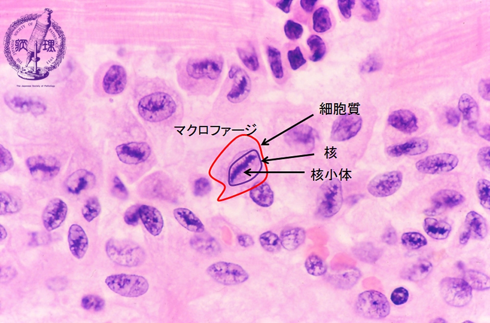 Microscopic image (HE, high power view): The activated macrophages within Aschoff nodules have abundant cytoplasm and nuclei with central condensed linear or ribbon-like chromatin which lends a “caterpillar appearance”.