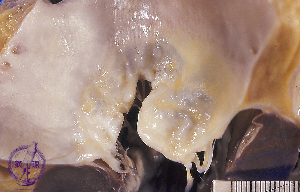 Macroscopic view (Post-rheumatic mitral valve stenosis): The mitral valve viewed from within the left atrium. The valves and chordae tendineae demonstrate thickening, shortening and fusion (arrow).