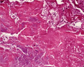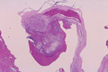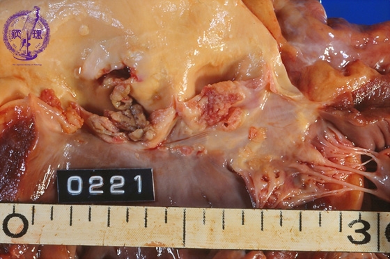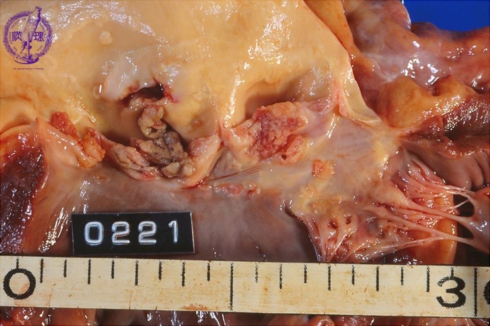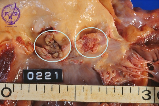 Macroscopic view (infective endocarditis): Destructive lesions with characteristic vegetations adhere to the aortic valve (within the circle).