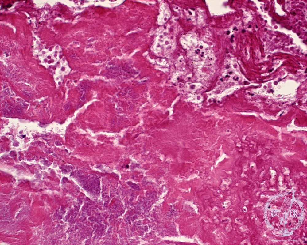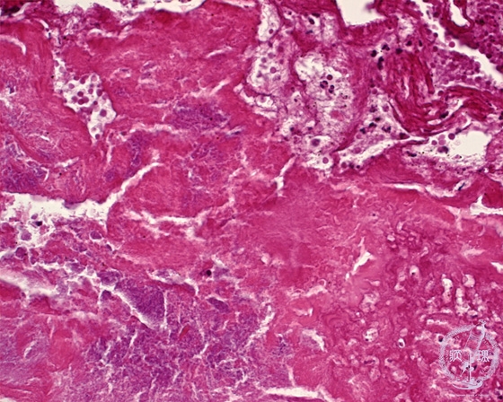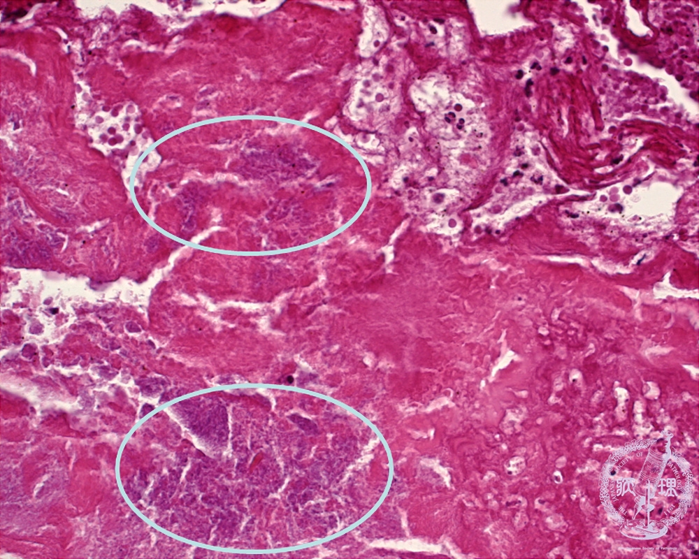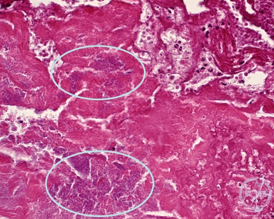 Microscopic image (HE, high power view): Vegetation due to infective endocarditis (mitral valve). Inflammatory exudate containing neutrophils (within the circle) and basophilic bacterial aggregates are observed.