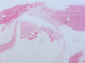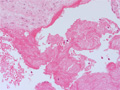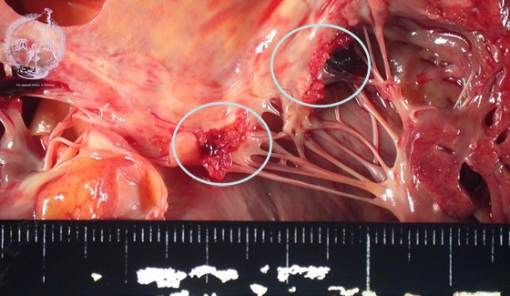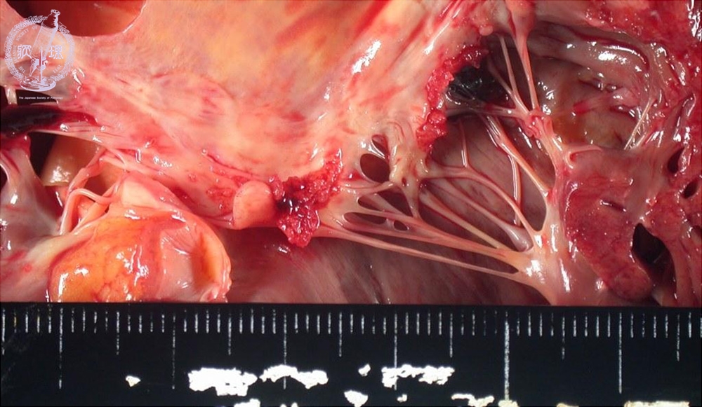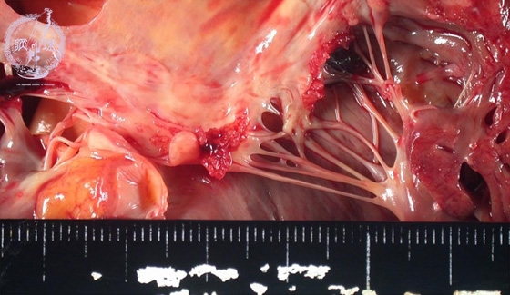 Macroscopic view (non-bacterial thrombotic endocarditis): There is an adherent vegetation at the mitral valve commissure. No destruction of the valve is seen.