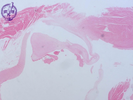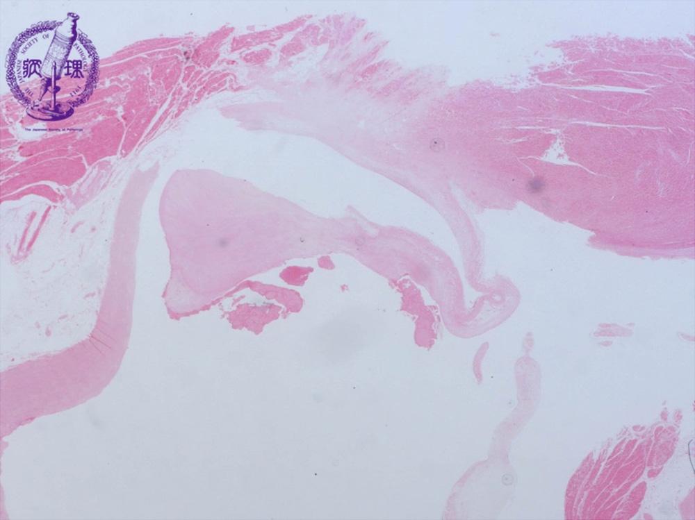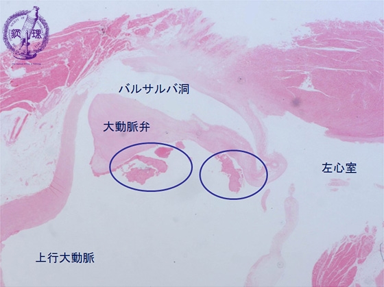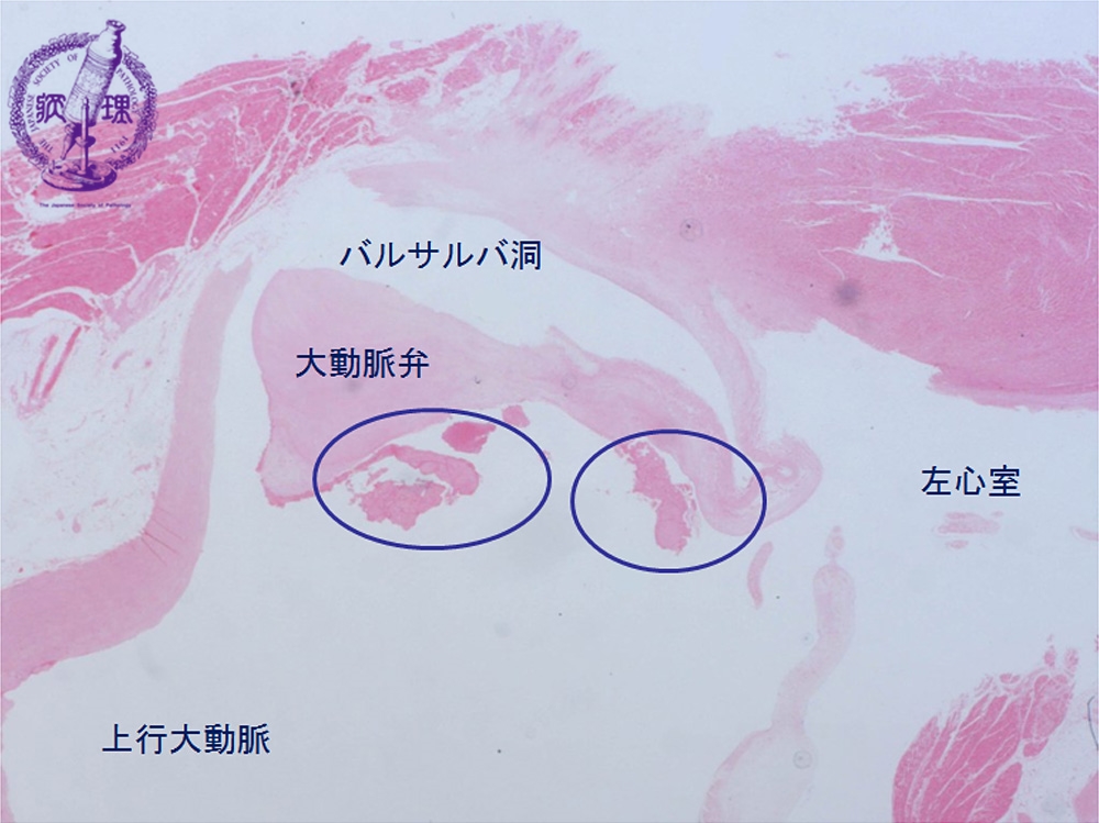 Microscopic image (HE, low power view): Non-bacterial thrombotic endocarditis of the aortic valve. Adhesion of polypoid thrombus to the ventricular side of the valve surface (within the circle) is observed.