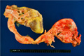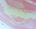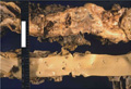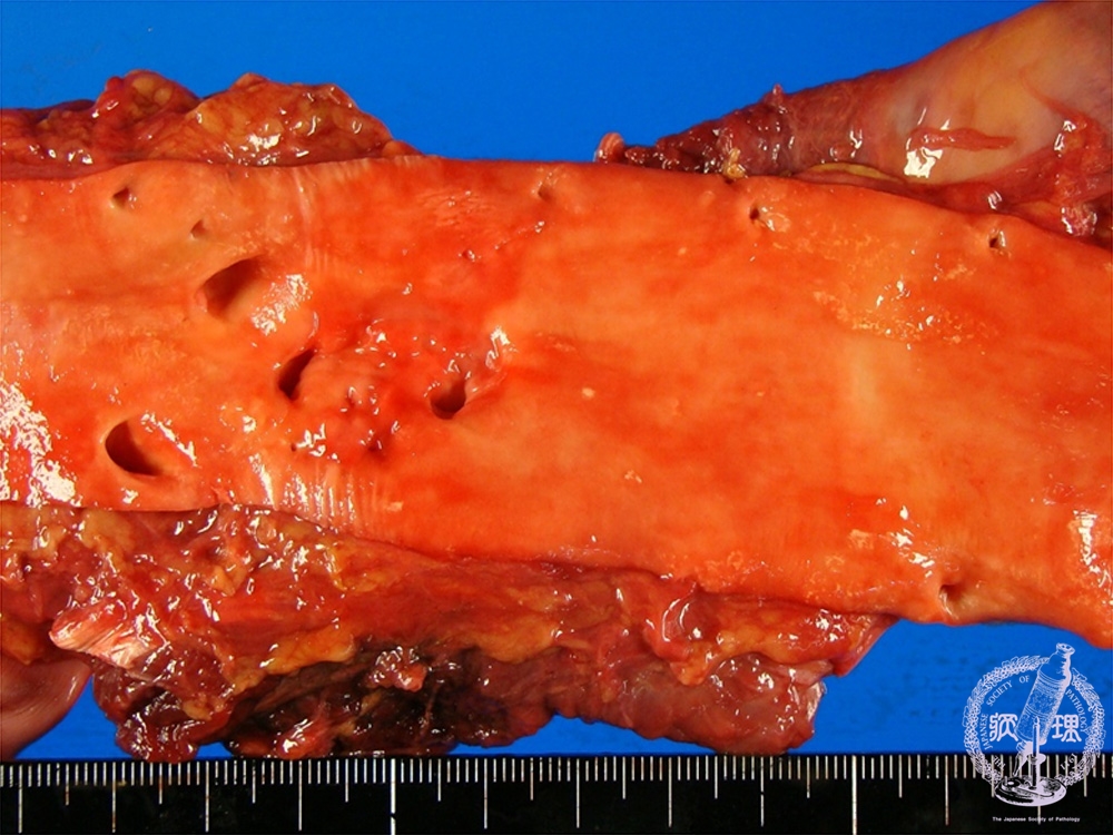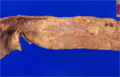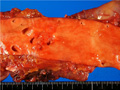 Macroscopic view (fatty streak): There is a relatively well circumscribed elevated yellowish plaque with preserved elasticity of the aorta (within the circle).