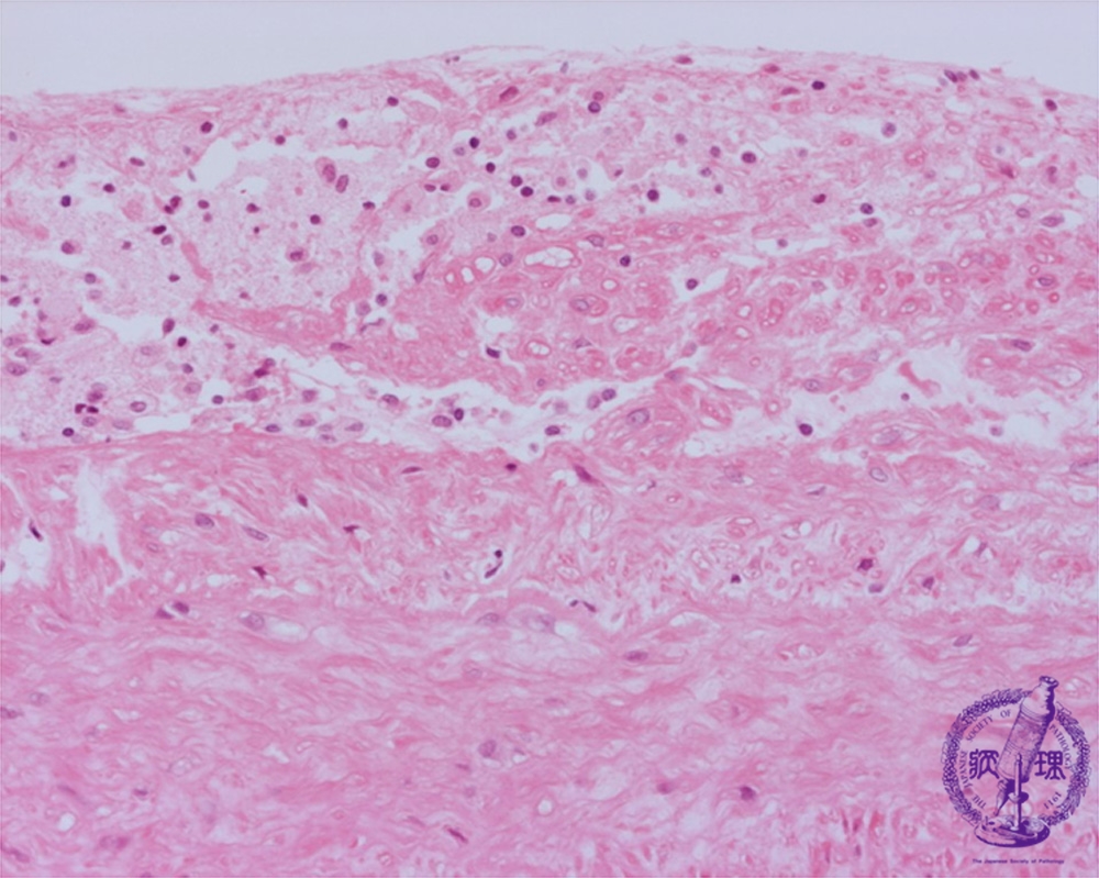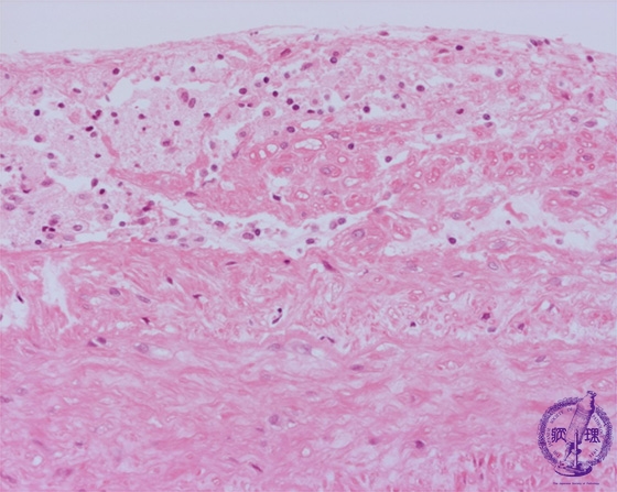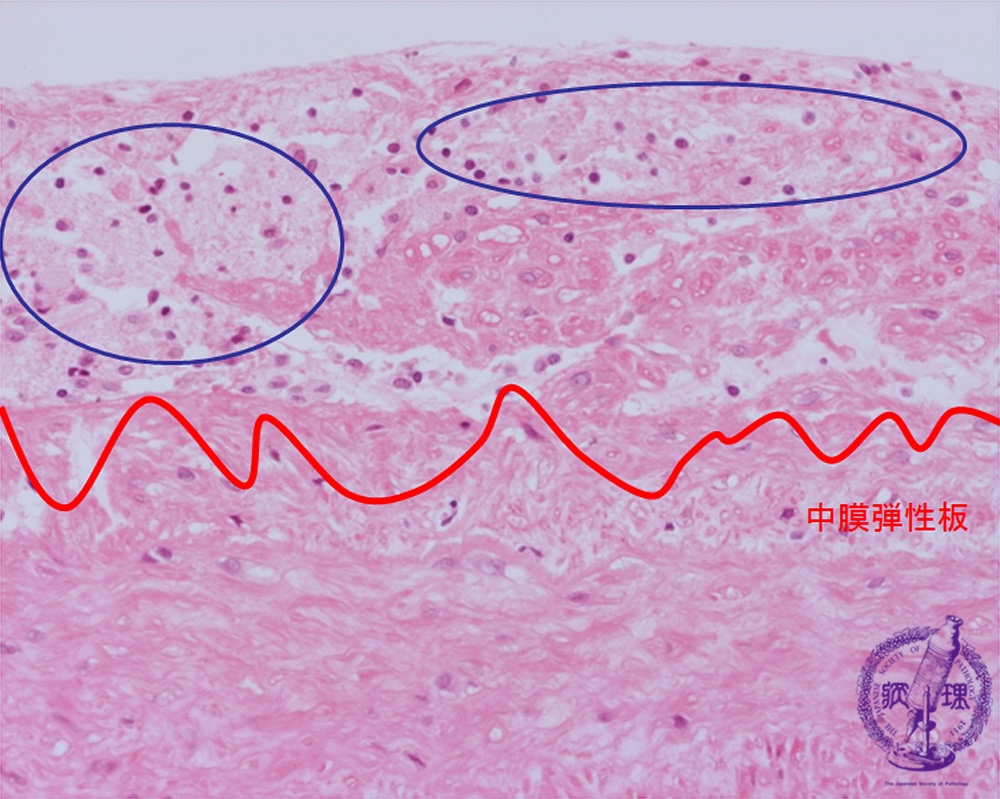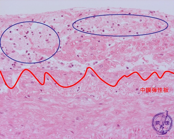 Microscopic image (HE, high power view): Sub-endothelial lipid accumulation within foamy (lipid laden) macrophages (blue circles). The elastic lamellae of the tunica media is partially effaced (red line).