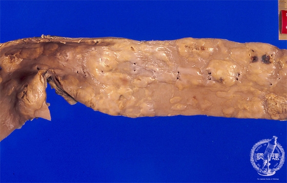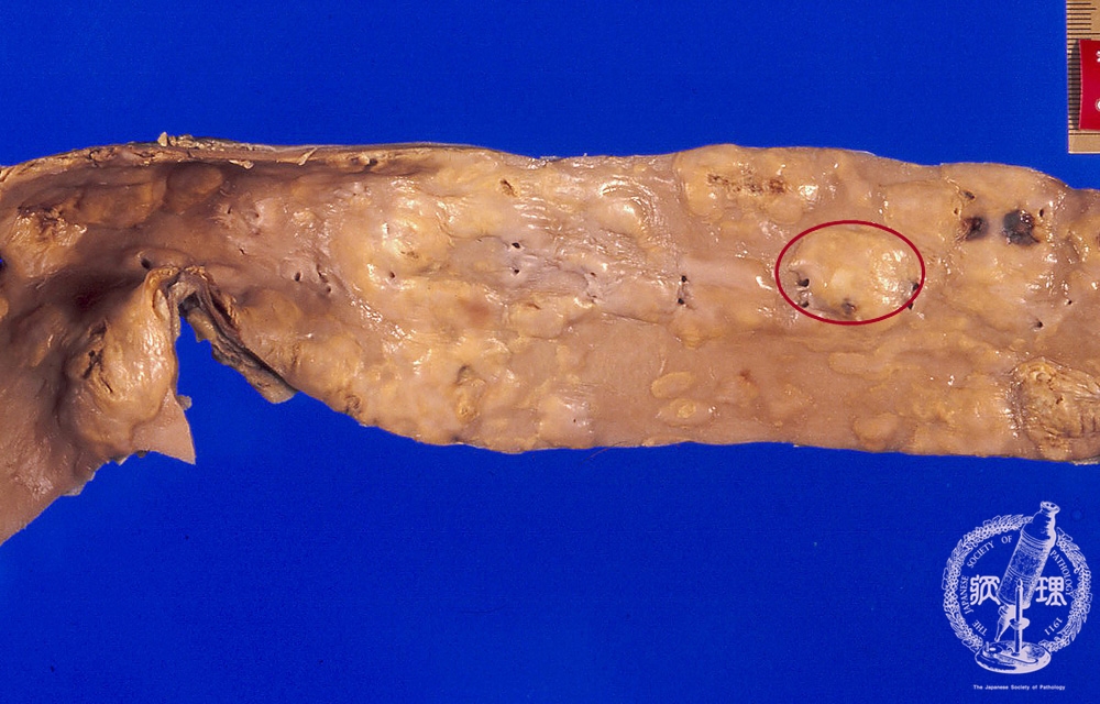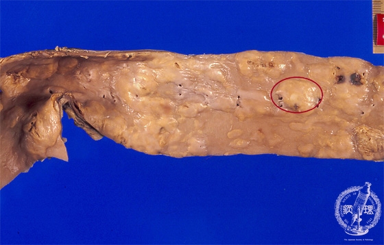 Macroscopic view (fibrous plaque): The elasticity of the aorta is relatively poor. Numerous translucent white pearl-like to whitish-gray elevated plaques are identified (within the circle).