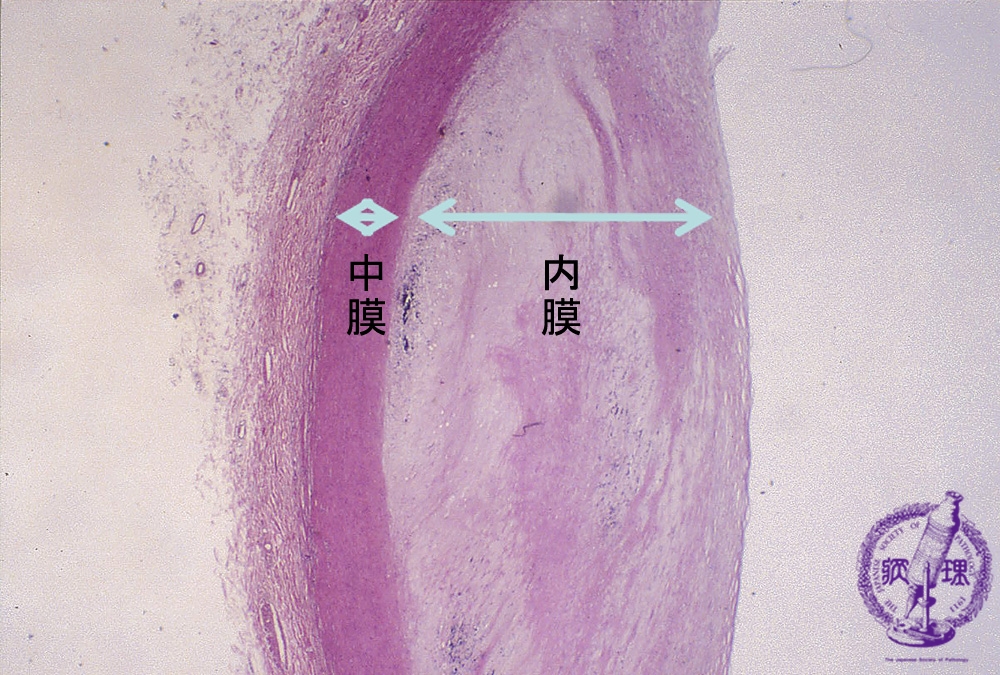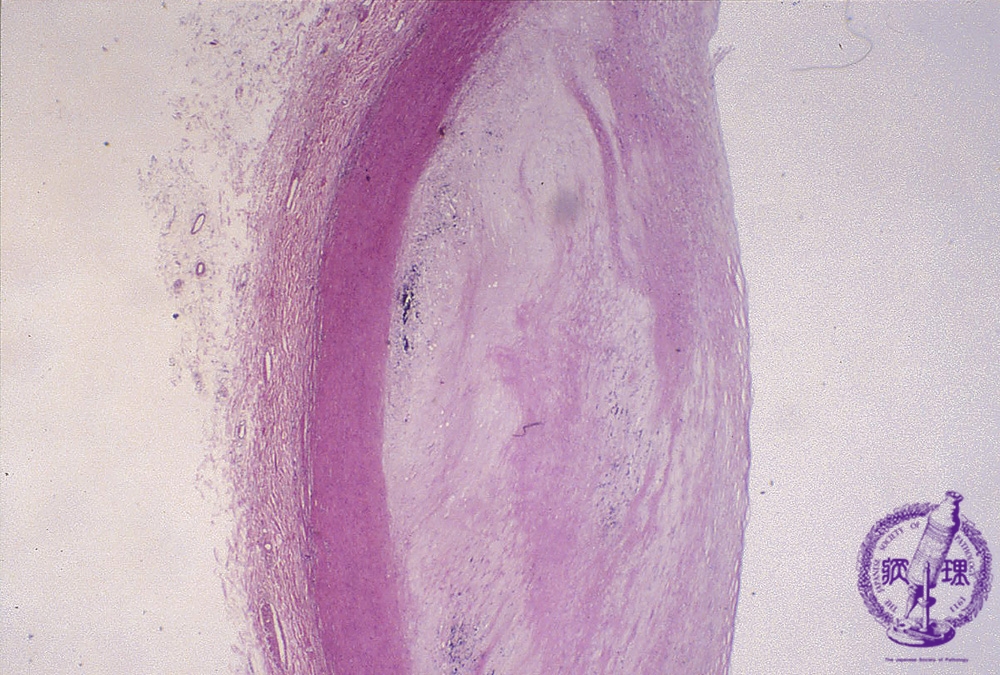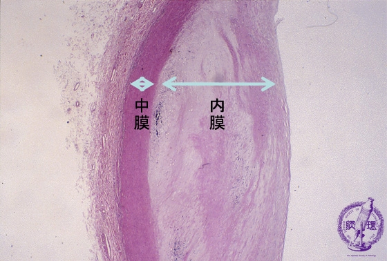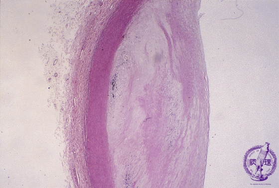 Microscopic image (HE, low power view): There is fibrous thickening of the intimal layer. The tunica is thinned. Atheroma is small or even sometimes absent.