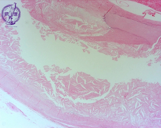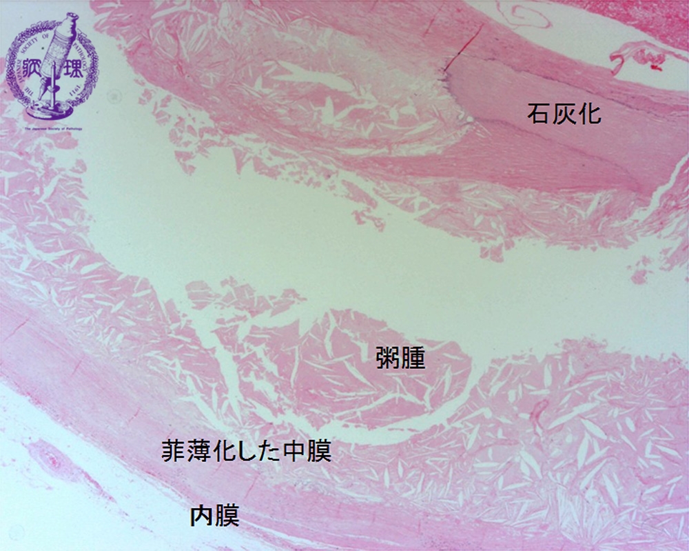 Microscopic image (intermediate power view): There is fibrotic thickening of the intima with fibroatheroma formation showing calcification and cholesterol clefts.