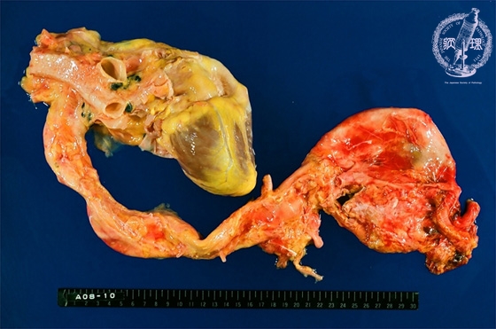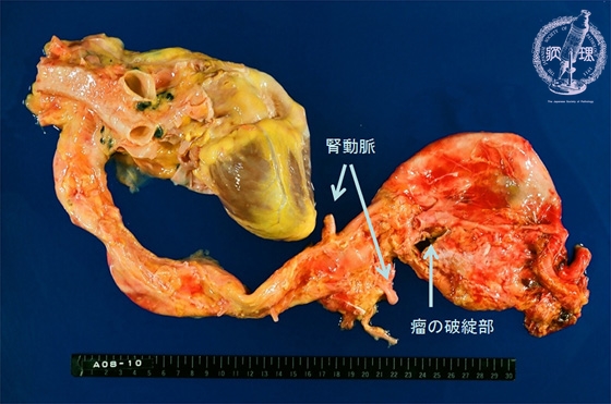Macroscopic view (abdominal aortic aneurysm): The aneurysm spans from the common iliac artery bifurcation to distal of the renal artery bifurcations.In the present case there is a disruption about 3cm length on the dorsal aspect of the abdominal aortic aneurysm.