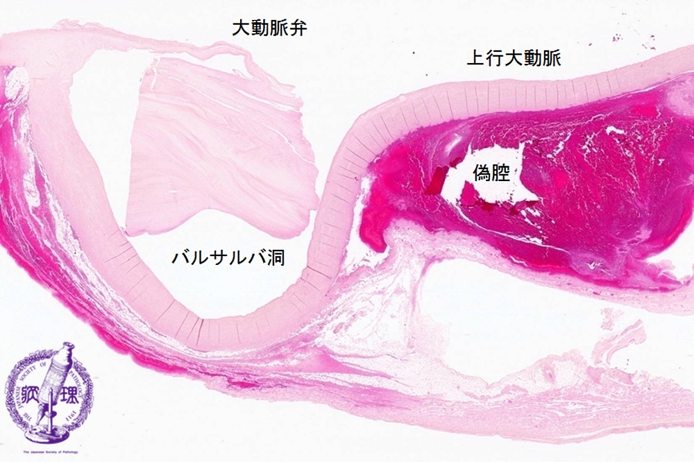 Microscopic image (HE, as seen via magnifying glass): Dissection of the ascending aorta with false lumen formation between the adventitia and media layer. The dissection is located just above the Valsalva sinus.