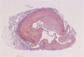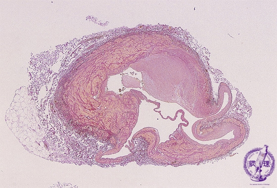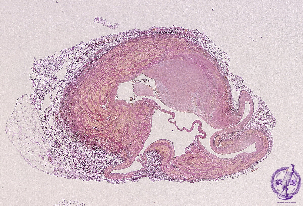 Microscopic image (EVG, low power view): Histopathology of varicose vein. There is venous wall thickening, fibrosis and focal aneurysm composed of vascular wall dilatation.