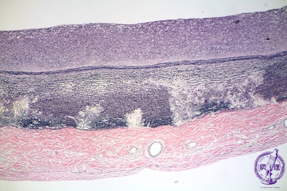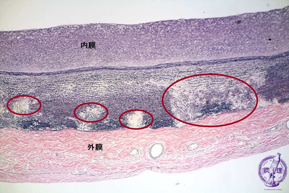 Microscopic image (EVG stain, low power view): There is disruption of the elastic lamellae in the outer layer of the media (within the circle).