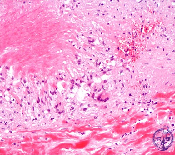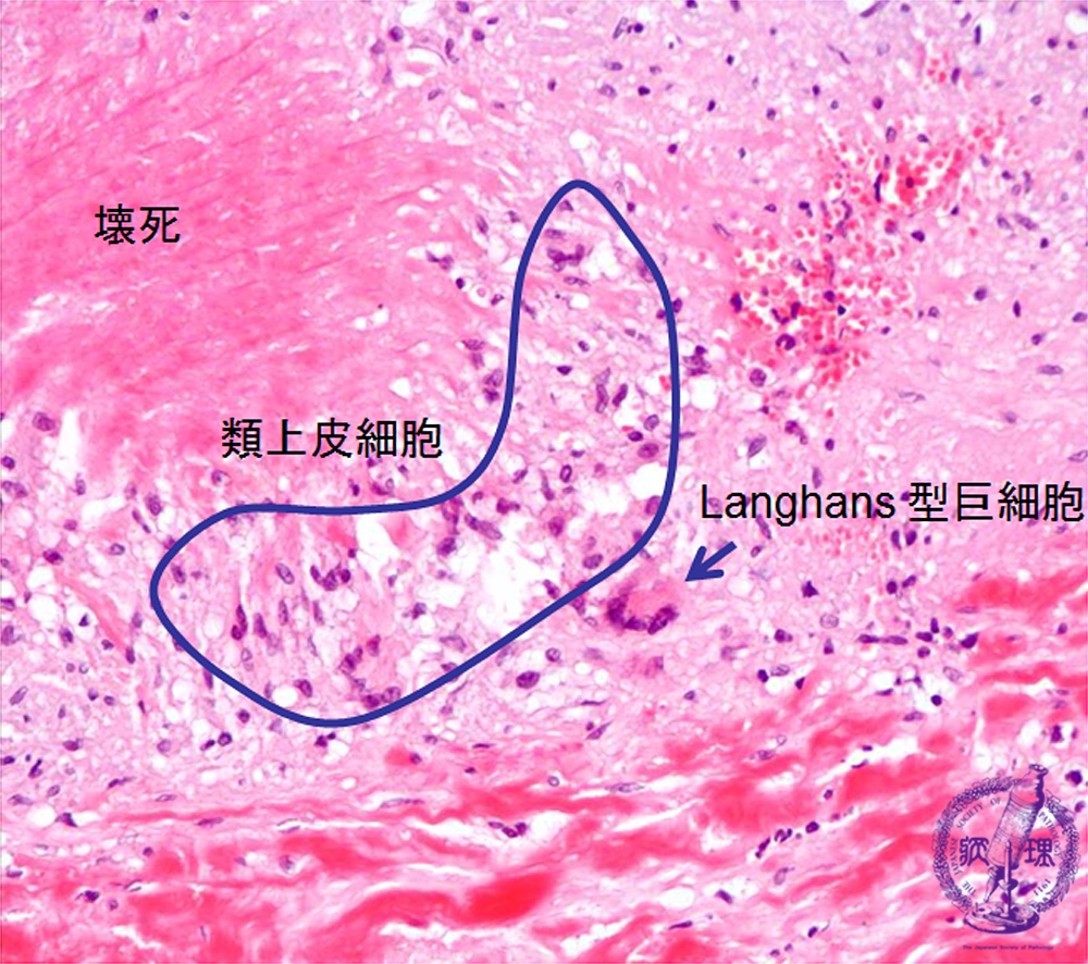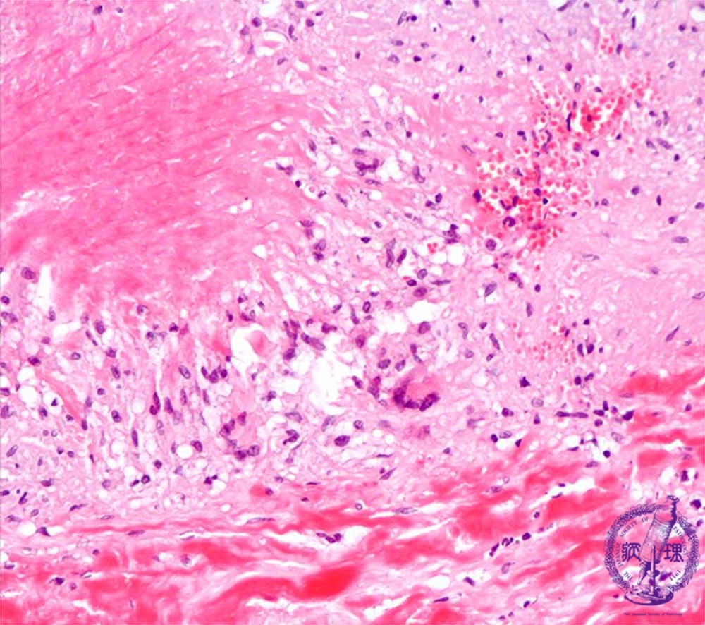 Microscopic image (HE, high power view): There is necrotizing, granulomatous inflammation composed of a Langhans giant cell infiltrate and central necrosis at the rupture site of the elastic lamellae.
