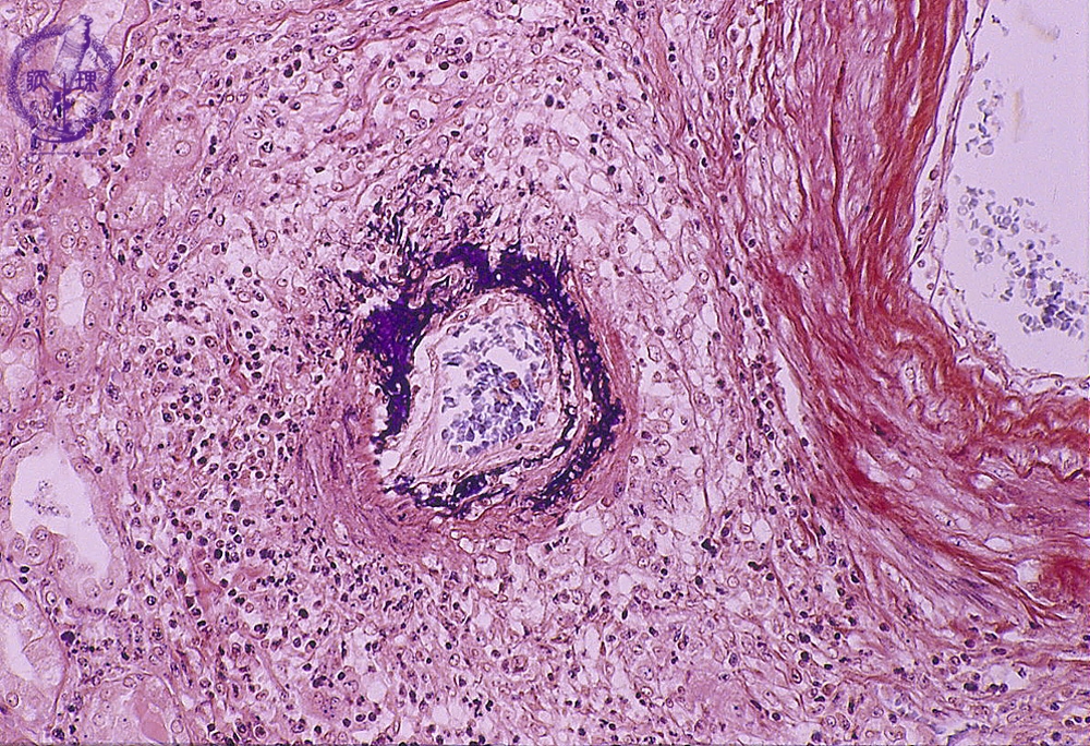 Microscopic image (PTAH stain, high power view): Polyarteritis nodosa involving the renal artery is typified(?) by a heavy inflammatory cell infiltrate and fibrinoid necrosis.