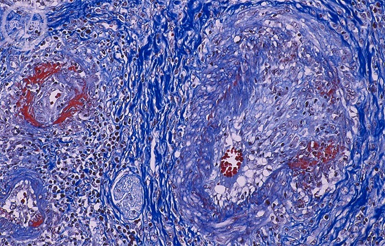 Microscopic image (Azan stain, high power view): Polyarteritis nodosa involving the liver. There is evidence of different phases of vasculitis.