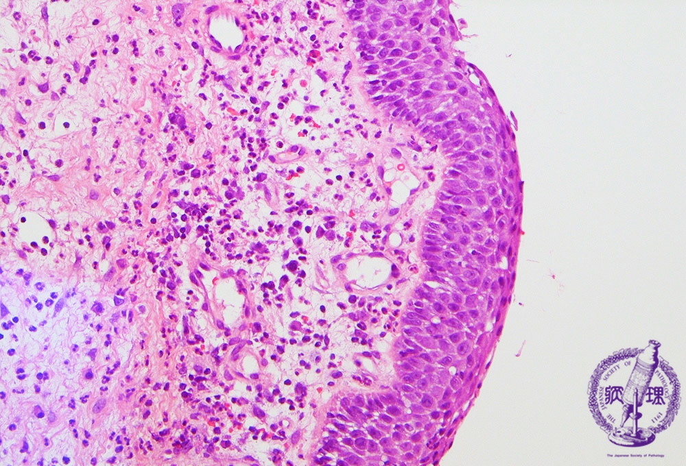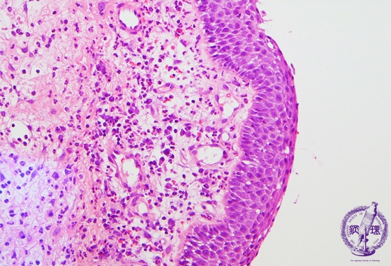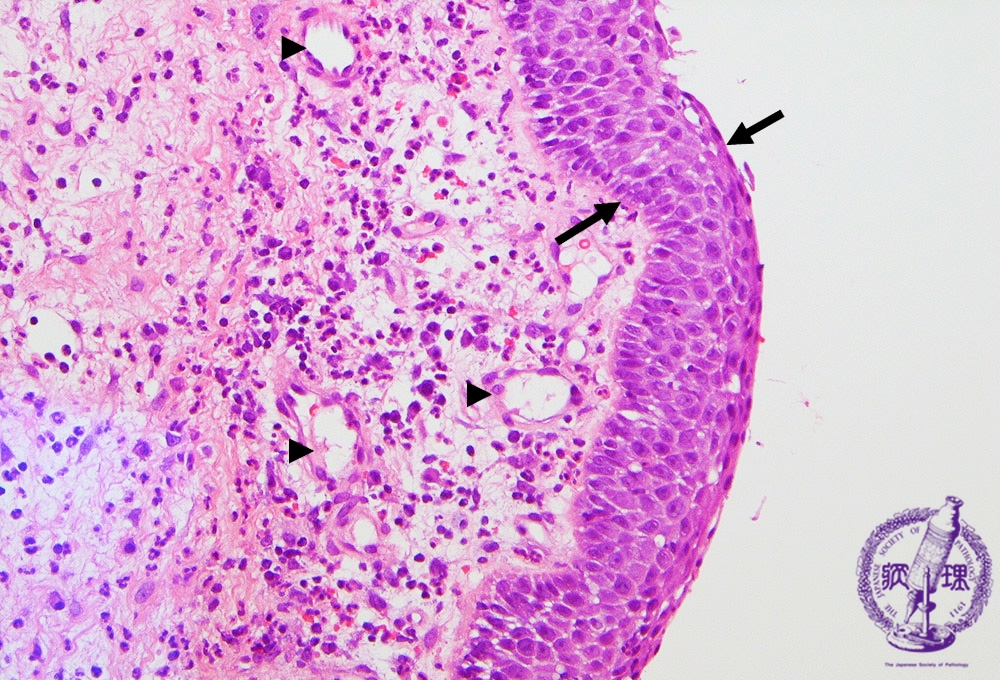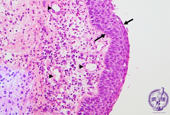 Microscopic view (intermediate power view): Ciliated columnar epithelium may show squamous metaplasia (arrow). Infiltration by eosinophils, mast cells, lymphocytes and plasma cells, and dilatation of capillary vessels are detected (arrow head).