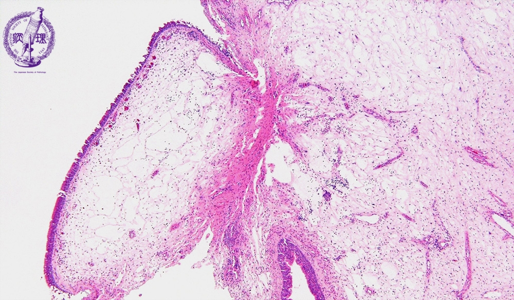 Microscopic view (intermediate power view): Ciliated columnar epithelium lines the mucosal surface, and marked edema and chronic inflammation are observed in the stroma.