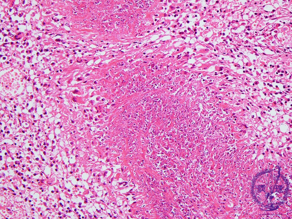 Microscopic view (intermediate power view): The typical histopathological finding is necrotizing granulomatosis demonstrated by necrotizing vasculitis and central necrosis with associated histiocytes, lymphocytes and multinucleated cells.
