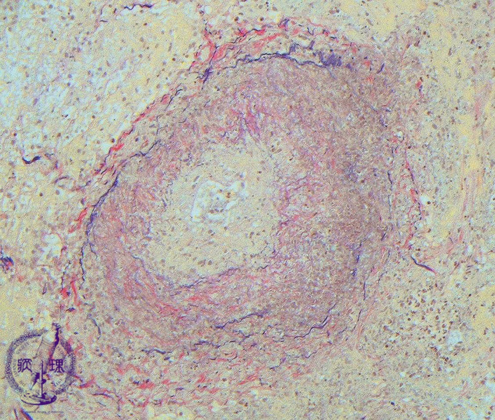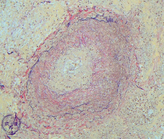 Microscopic view (intermediate power view; EVG staining): EVG stainingdemonstrates the residue of elastic fibers, suggesting necrotizing vasculitis.