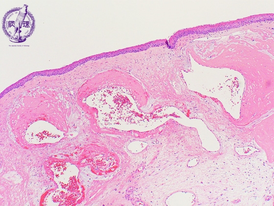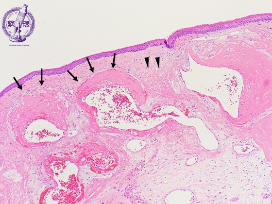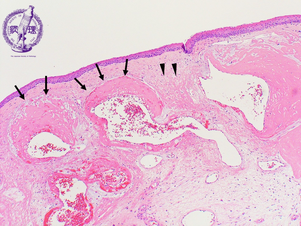 Microscopic view (intermediate power view): Fibrin accumulates in the fibrotic stroma (arrow head) and forms thrombi within the dilated capillaries (arrow). These findings, which typically are not prominent in early lesions, suggest that this is not a fresh lesion.