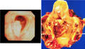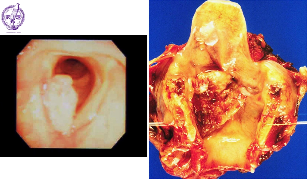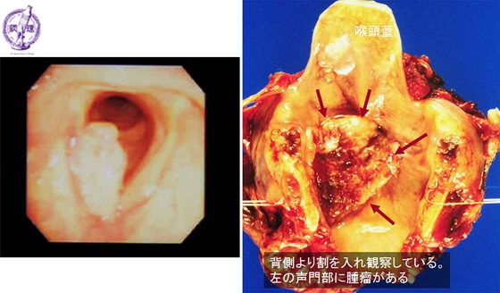 Macroscopic view (left; endoscopic view, right; removed specimen): Laryngeal cancer usually develops as an elevated lesion with ulcer formation. As demonstrated in this case, carcinoma derived from the vocal cord may invade into the upper vocal cord beyond the larynx ventricle, and in such cases is frequently accompanied by lymph node metastases and poor prognosis.