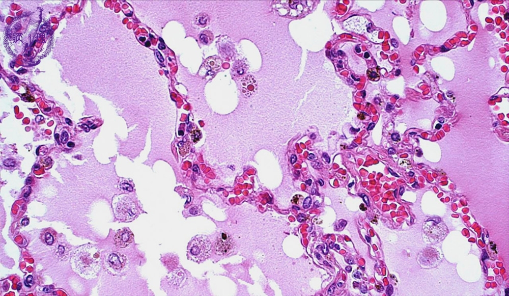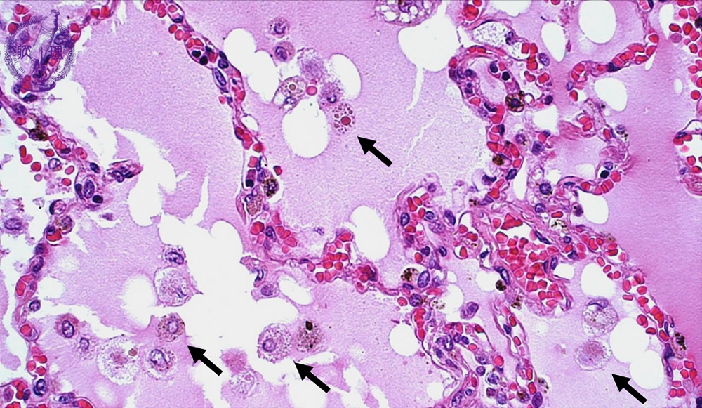 Microscopic view (HE stain, high power view): In this especially congested area, interalveolar septa show capillaries packed with red blood cells. There are many macrophages (arrow), which phagocytize the leaking plasma transudate and red blood cells.