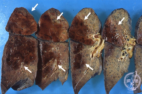 Macroscopic view (post-fixation): Hemorrhagic (red) infarct characterized by well-defined borders, is seen in the posterior upper and lower lobes of right lung, (arrow).