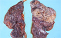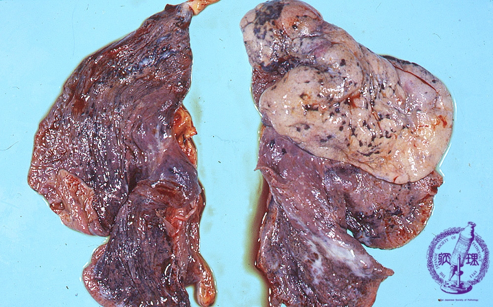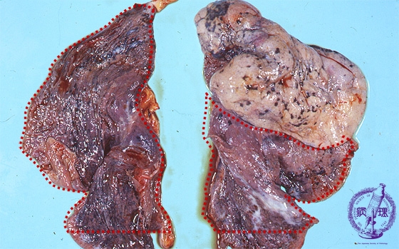 Macroscopic view: Secondary atelectasis (collapse) occurs following air space dilatation. The entire left lung and middle and lower lobes of the right lung (dotted line) are collapsed.