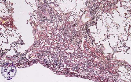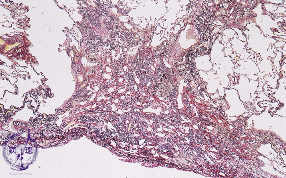 Microscopic view (HE stain, low power view): Long-standing collapse induces fibrosis (collapse fibrosis).