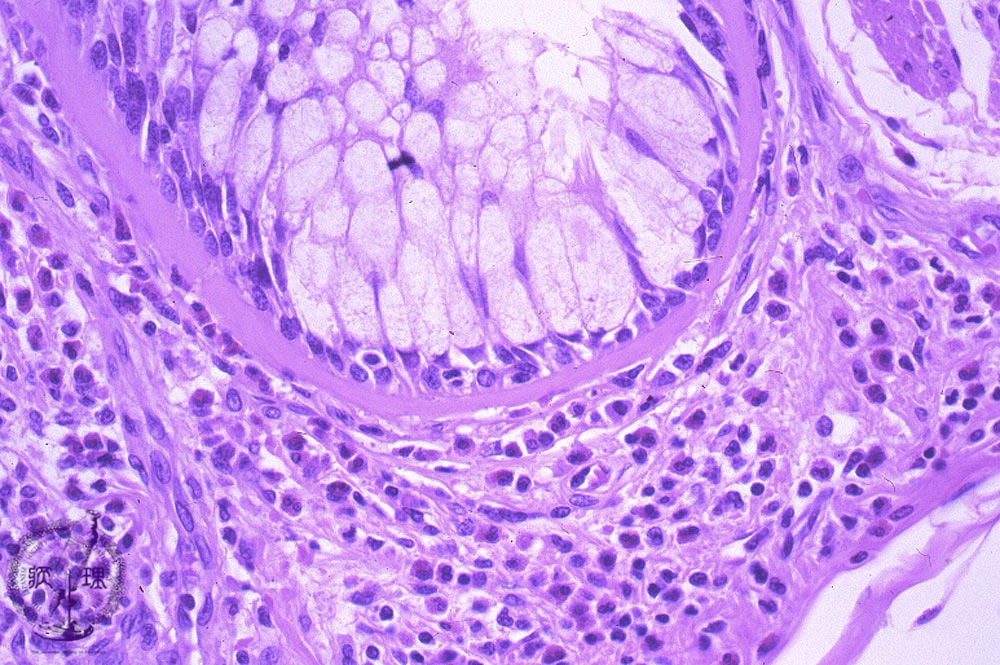 Microscopic view (HE stain, high power view): The bronchial epithelium shows goblet cell metaplasia, basement membrane thickening, and a submucosal cellular infiltrate including eosinophils.