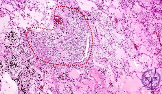 Microscopic view (HE stain, low power view): The bronchiole is filled with purulent debris and surrounded by edema and an inflammatory infiltrate. Bronchial structure is obscured due to destruction of bronchial alveoli (dotted line).