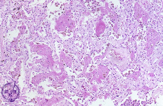 Microscopic view (HE stain, low power view): Prominent alveolar fibrin deposition with septal edema, congestion and a cellular infiltrate are seen. Note that, unlike in bronchopneumonia, alveolar structure is preserved.