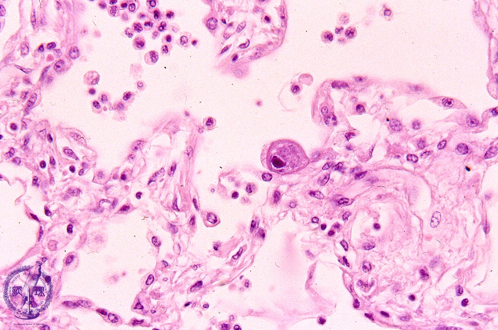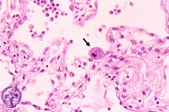 Microscopic view (HE stain, Low-power- view): Within the enlarged nucleus of an alveolar epithelial cell, a large eosinophilic inclusion body (arrow) is seen.