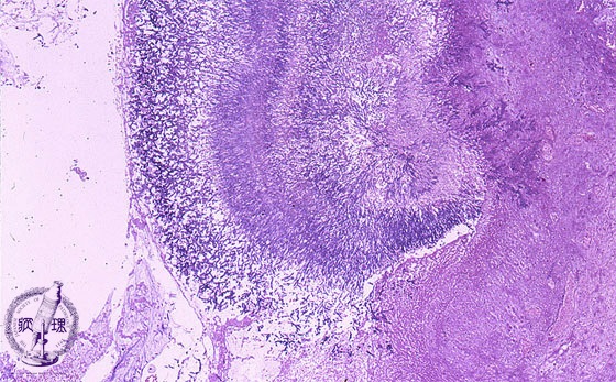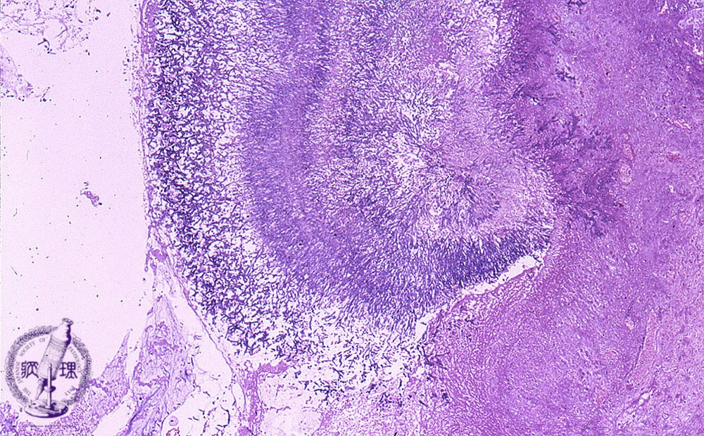 Microscopic view (HE stain, low power view): Hematoxylin stained aspergillus hyphae are septate, 3-11um in diameter and demonstrate Y-shaped branching at a roughly 45 degree angle, characteristics which help differentiate from other fungi.