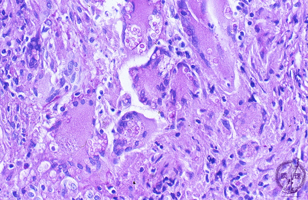 Microscopic view (PAS stain, high power view): The mucopolysaccharide membrane of Cryptococcus is red-violet on PAS stain. Unlike to aspergillus, Cryptococcus is a round, yeast-like fungus.