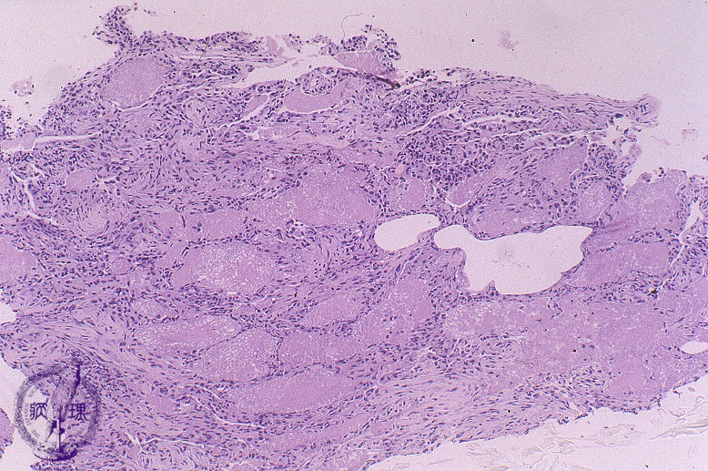Microscopic view (HE stain, low power view): Histological section of TBLB (transbronchial lung biopsy). Within alveoli, eosinophilic and foamy exudates are seen.