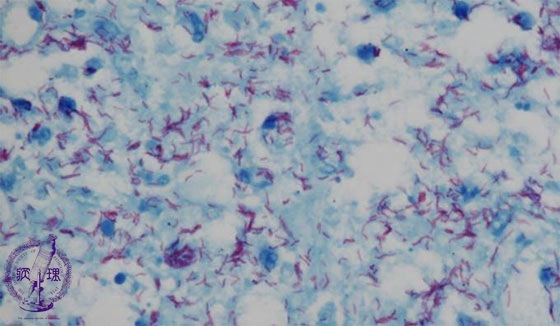Microscopic view (Ziehl-Neelsen stain, high power view): Acid-fast-stain (Ziehl-Neelsen stain) can selectively highlight mycobacterium. A red stained mycobacterium (tubercle bacillus) is seen.