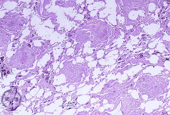 Microscopic view (HE stain, low power view): Disease incorporates uniform granulomatous lesions and spreads via hematogenous dissemination.