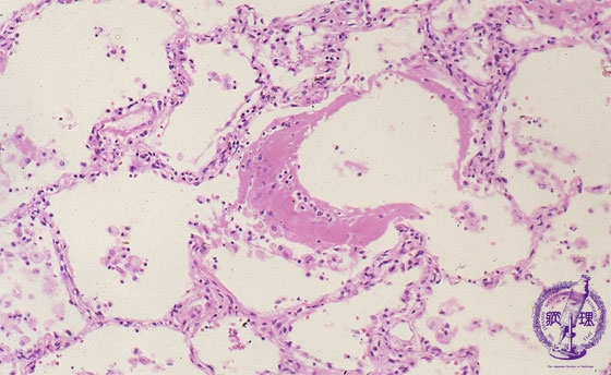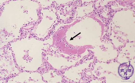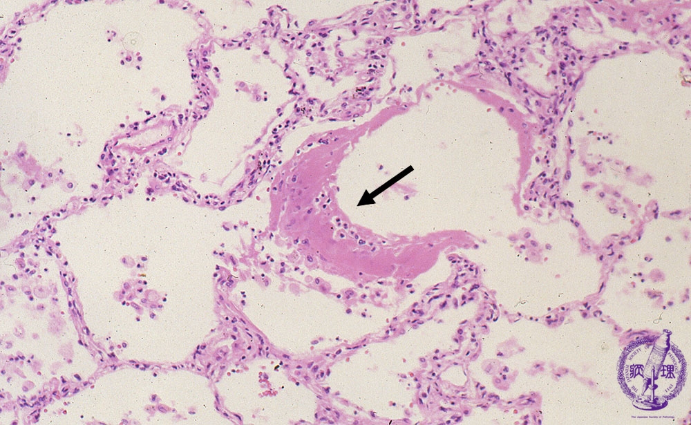 Microscopic view (HE stain, Middle-power-view): Hyaline membrane (arrow) is seen forming along the alveolar surface consistent with the exudative phase.