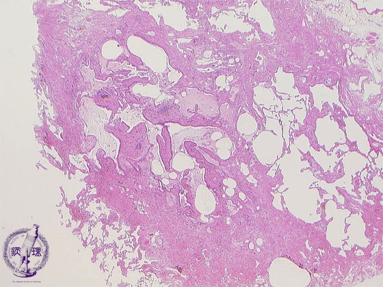 Microscopic view (HE stain, low power view): Airspace and bronchiolar dilatation, alveolar collapse and disappearance, and peribronchiolar fibrosis and small arterial wall hypertrophy are seen.