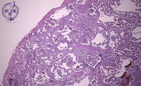 Microscopic view (HE stain, low power view): Alveoli show accumulation of mononuclear macrophages and proliferation of type II pneumocytes and there is a lymphoplasmacytic infiltrate of the interalveolar septum.