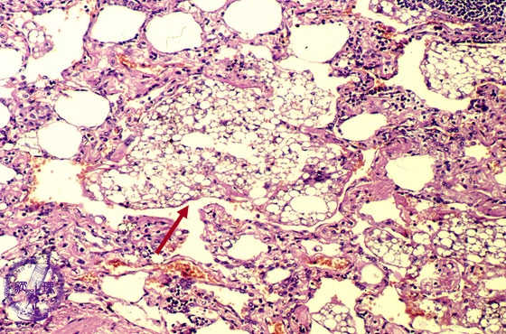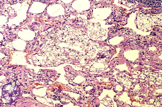 Microscopic view (HE stain, Middle-power-view): Lipid and cholesterol crystal laden macrophages are seen within alveoli and alveolar septa accompanied by an inflammatory cell infiltrate.