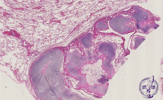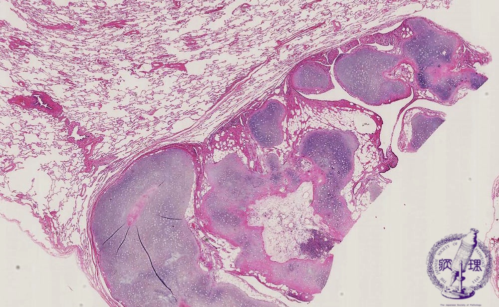 Microscopic view (HE stain, low power view): The tumor is well-demarcated and composed of cartilage, adipose tissue and bronchial epithelium, all of which are normal bronchus components; however, the elements lack any normal organization. Characteristically, the surrounding lung parenchyma shows no abnormal findings.