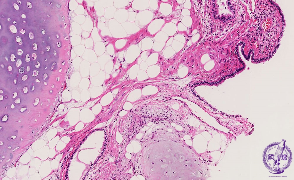 Microscopic view (HE stain, Middle-power-view): The cartilage, adipose tissue and bronchial epithelium show no evidence of cellular or structural abnormality. In addition, smooth muscle, collagenous tissue and or myxomatous elements may be intermingled.