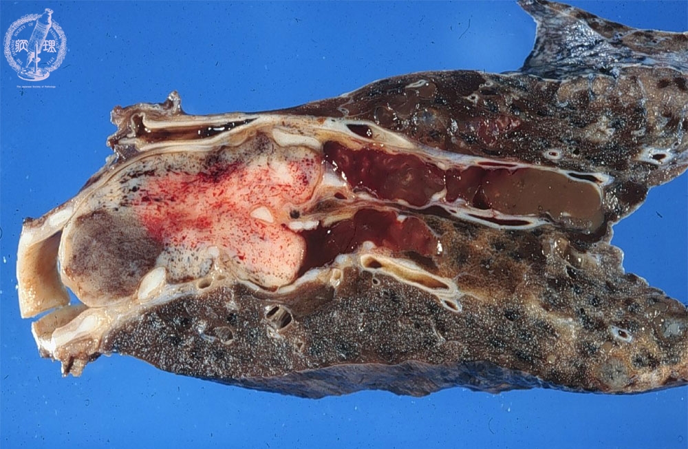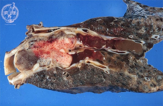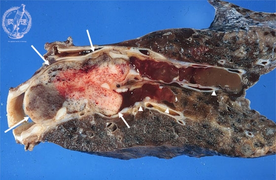 Macroscopic view: Carcinoid tumor is typically located within the large bronchus as a polypoid tumor (arrow). There is luminal obstruction associated with severe mucus retention in peripheral bronchi (arrow head).