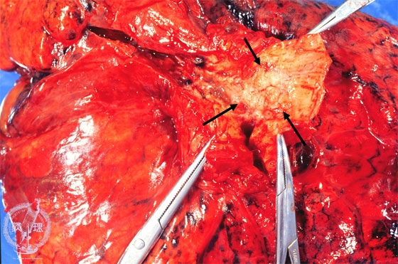 Macroscopic view (Unfixed, fresh specimen): Upon opening of the left upper bronchus, obliteration of the bronchial mucosal folds due to invasive carcinoma is evident (arrow).