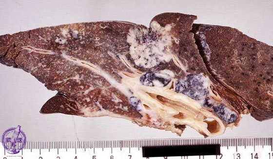 Macroscopic view: Adenocarcinoma of lung. Tumor nodule is located beneath and invades the visceral pleura. Peri-bronchial lymph nodes (arrow) are enlarged. The tumor is small, but shows advanced stage.