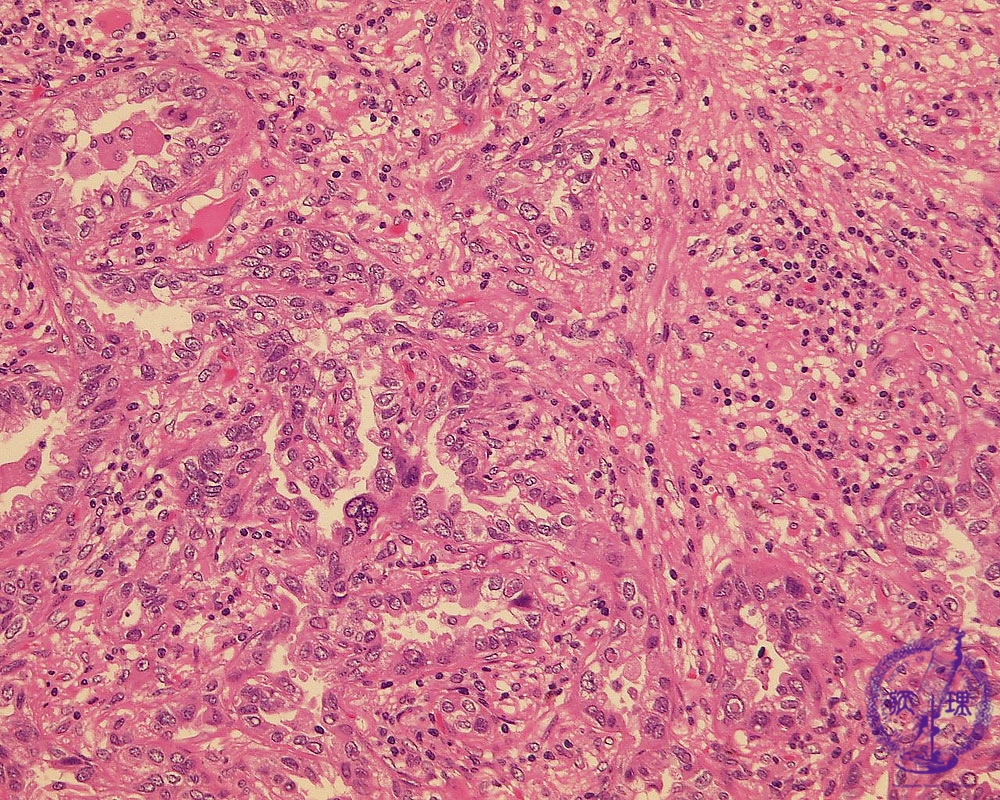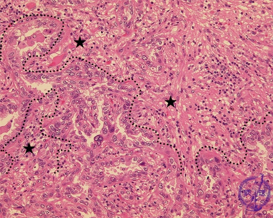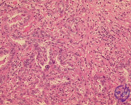 Microscopic view (HE stain, high power view): Adenocarcinoma of lung. Centrally within the carcinoma, tumor cells form irregular tubules and proliferate by invasion. There is a predominantly lymphocytic infiltrate within the complex, intricate stroma.