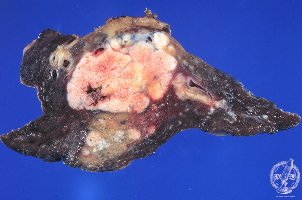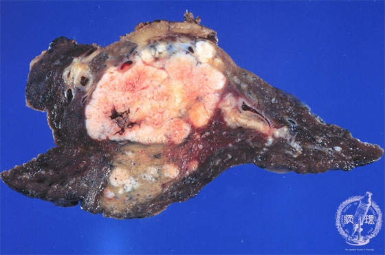 Macroscopic view: Large cell carcinoma of lung. In most cases of large cell carcinoma, a large nodule forms with a distinct margin. Around this nodule, intrapulmonary metastasis (arrow) or invasion through the bronchus (arrow head) is seen.
