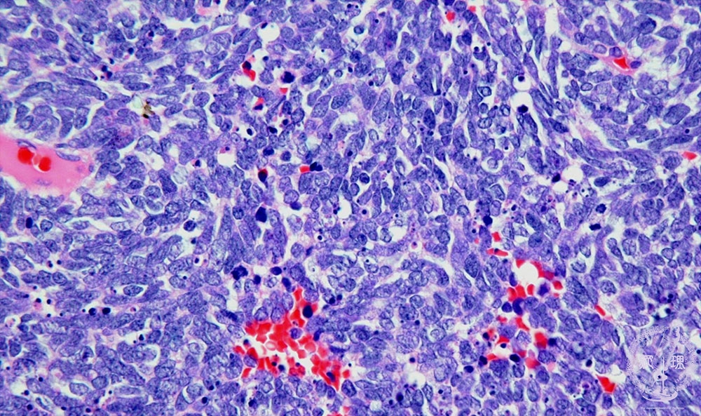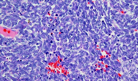 Microscopic view (HE stain, high power view): Small cell carcinoma of lung. Carcinoma cells have scant cytoplasm and a high N/C ratio. Many mitotic (arrow) and apoptotic (arrow head) figures are seen indicating high proliferative activity.