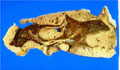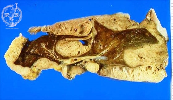 Macroscopic view: Cut surface of lung. A prominent, thick pleura completely surrounds the lung with replacement and atelectasis of the underlying lung parenchyma. The thick white pleura consists entirely of mesothelioma.